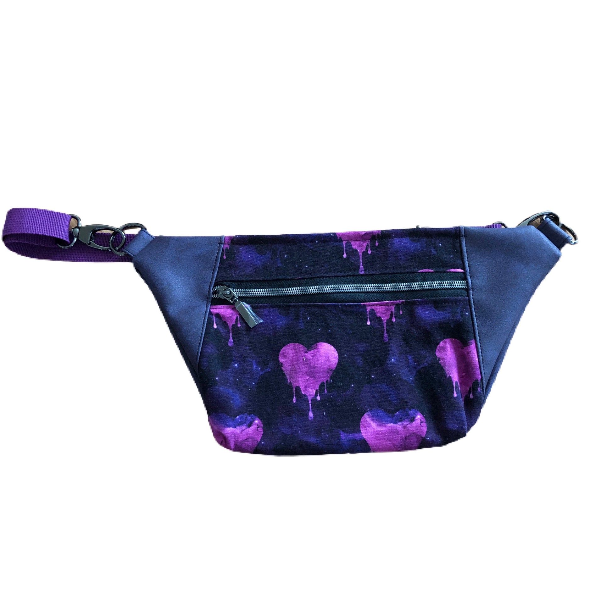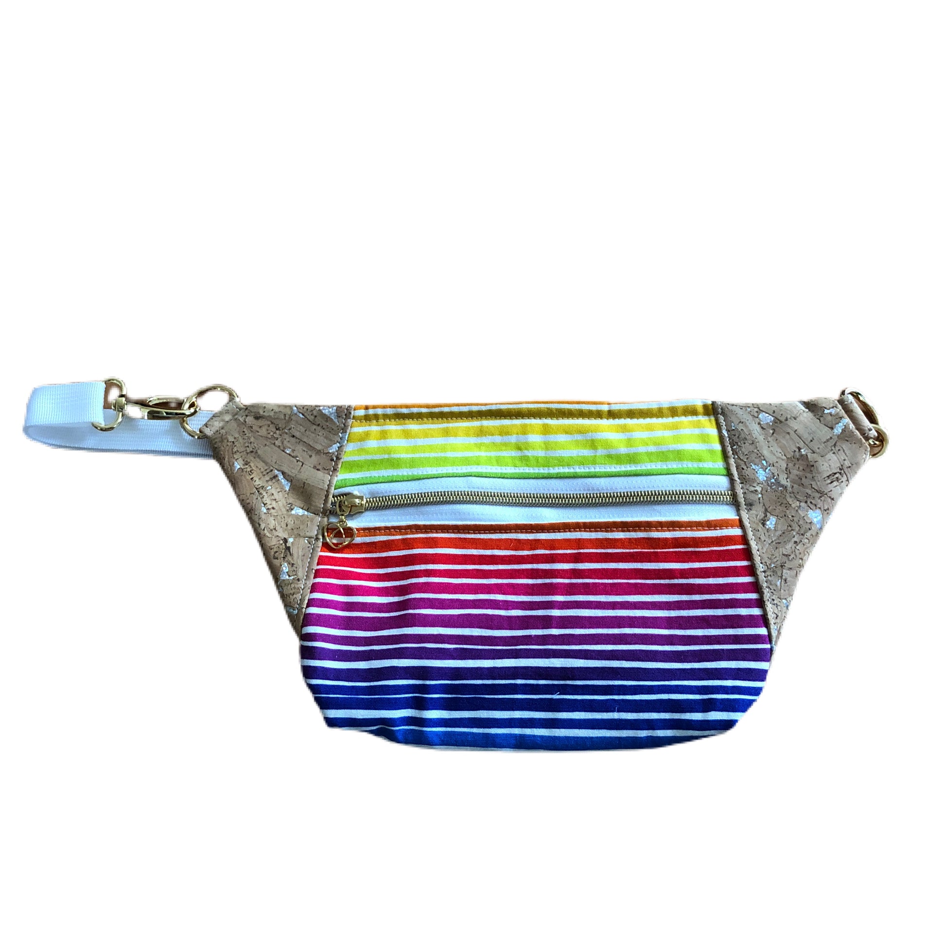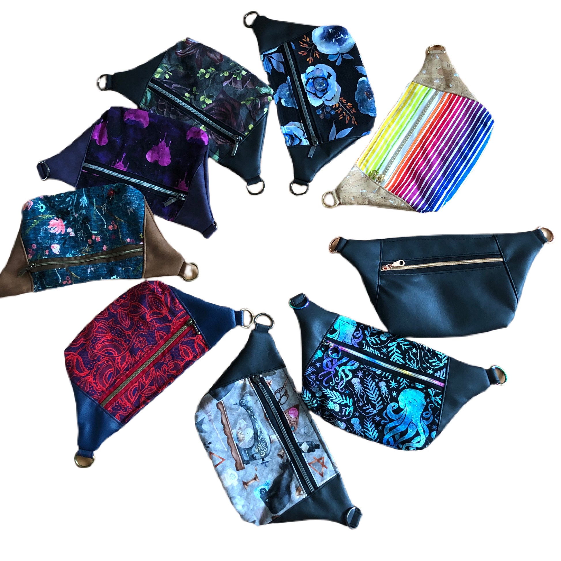 These hip bags feature high quality materials in fun prints, metal hardware and an adjustable waistband that will extend long enough to convert to a sling bag.