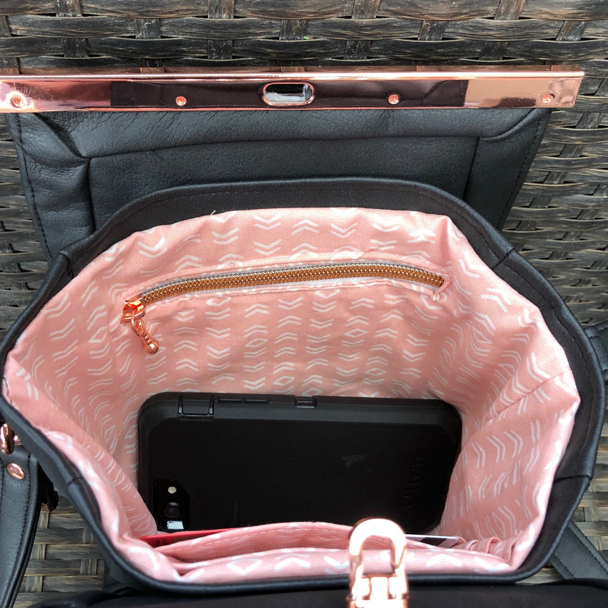 With a charcoal faux leather and rose gold hardware, this bag is a showstopper